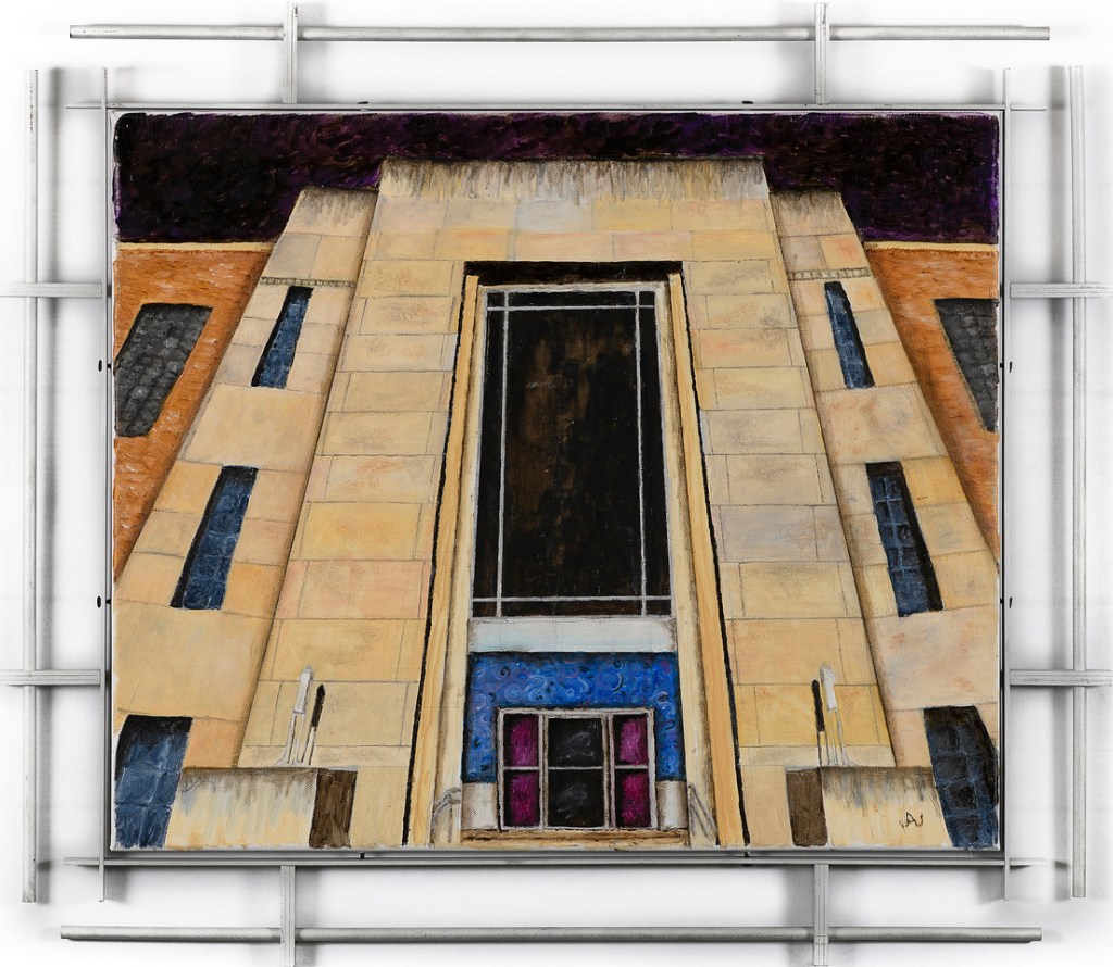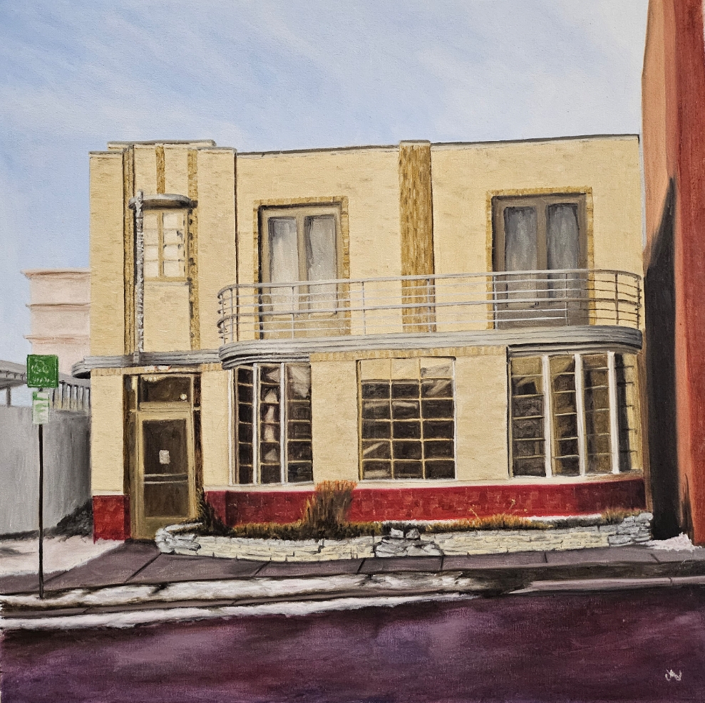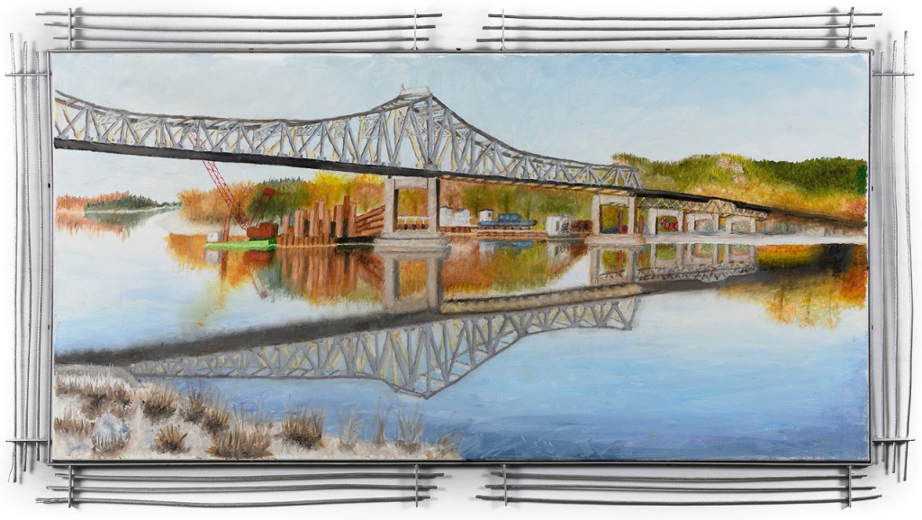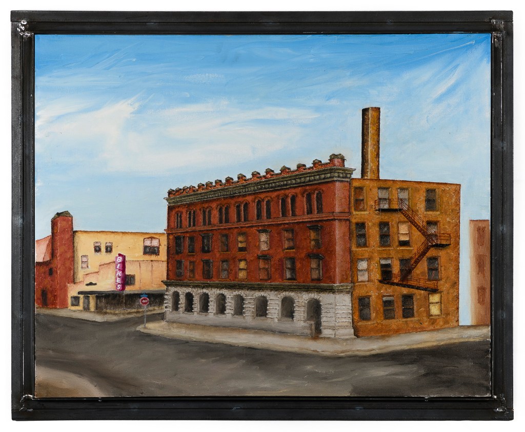 “Bridge Reflections” 24″x48″ OIl On Canvas Scrap Metal Frame $1500 Winona Minnesota Interstate Bridge “Outside The Coffee Shop” 30″x30″ Oil On Canvas Ceramic Fram by Ginni Cormack $900 Winona Minnesota “Where Bread Comes From” 20″x24″ Oil On Canvas Scrap Metal Frame $600 Tri State Milling Winona Minnesota “Weird View” 24″x24″ Oil On Canvas Scrap Metal Frame $500 Winona Minnesota City Hall “Old Exchange Building” 24″x30″ Oil On Canvas Scrap Metal Frame $500 Winona Minnesota “West Broadway” 36″x36″ OIl On Canvas $1200